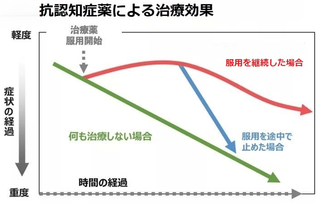 また前述したアルツハイマー型認知症、レビー小体型認知症の患者様には、保険適用で抗認知症薬を処方することも可能です。効果としましては図にある通り、未治療の場合と比較すると「認知症の症状進行をある程度の期間、遅らせることが出来る」といったものとなります。詳しくお知りになりたい方は、診察時に医師までお尋ねください。